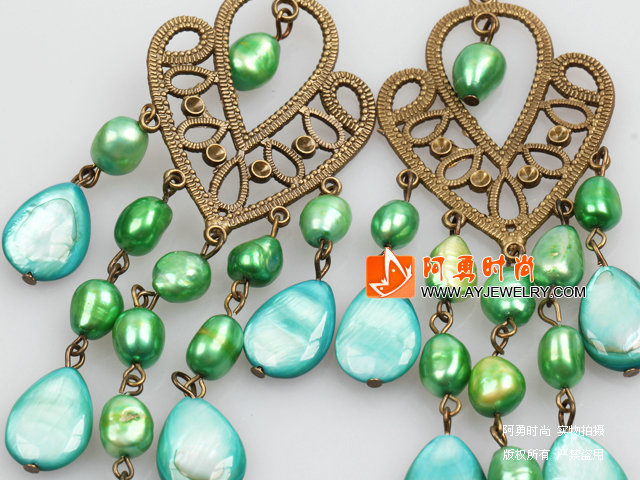 复古绿色珍珠水滴贝壳长款耳环 - 编号:E1787