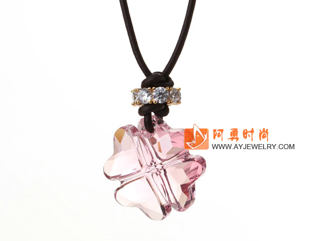 透明粉色奥地利水晶四叶草项链 皮绳吊坠款 - 编号:RX2062