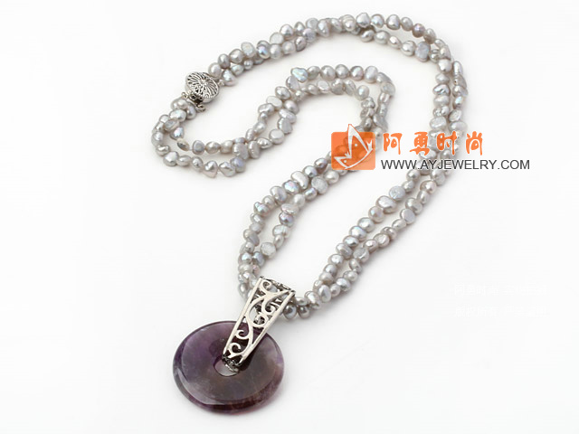 灰珍珠紫晶平安扣项链 - 编号:X554