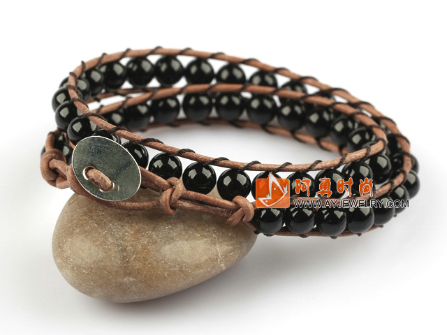 黑玛瑙牛皮绳编织手链 - 编号:Y1461