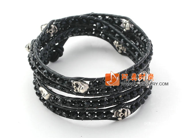 黑色水晶骷髅头皮绳手链 - 编号:Y1625