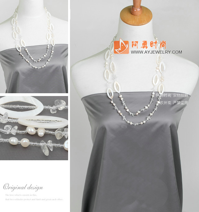 - 白珍珠 白水晶 绿色贝壳花项链